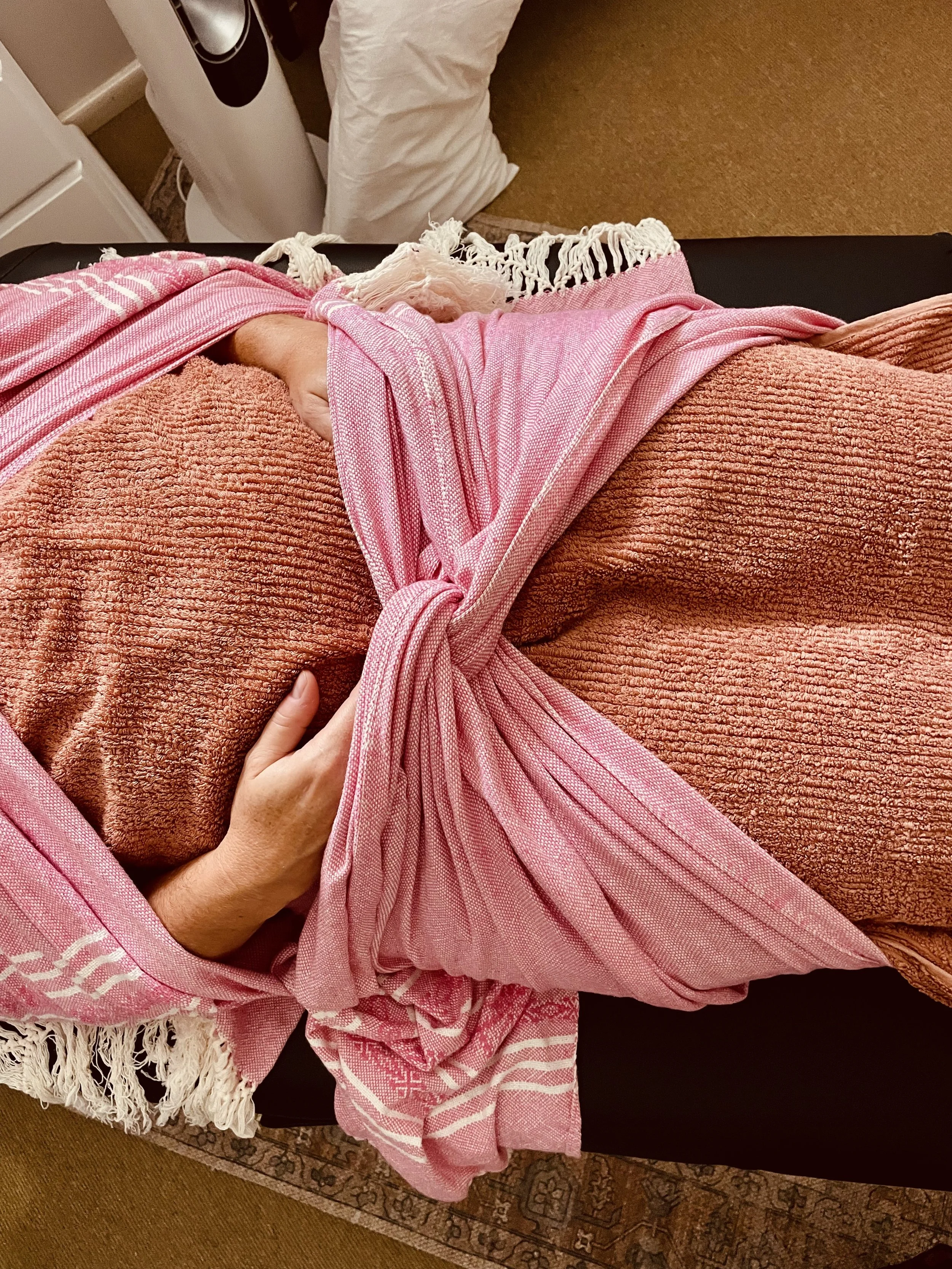 The treatment is finished with a beautiful restoration of the soul wrapping ceremony, where I wrap your feet, hips, shoulders and head, where you’ll rest for roughly 5 minutes. The wrapping is optional, and if you need to be unwrapped at anytime, just let me know and I’ll unwrap you.