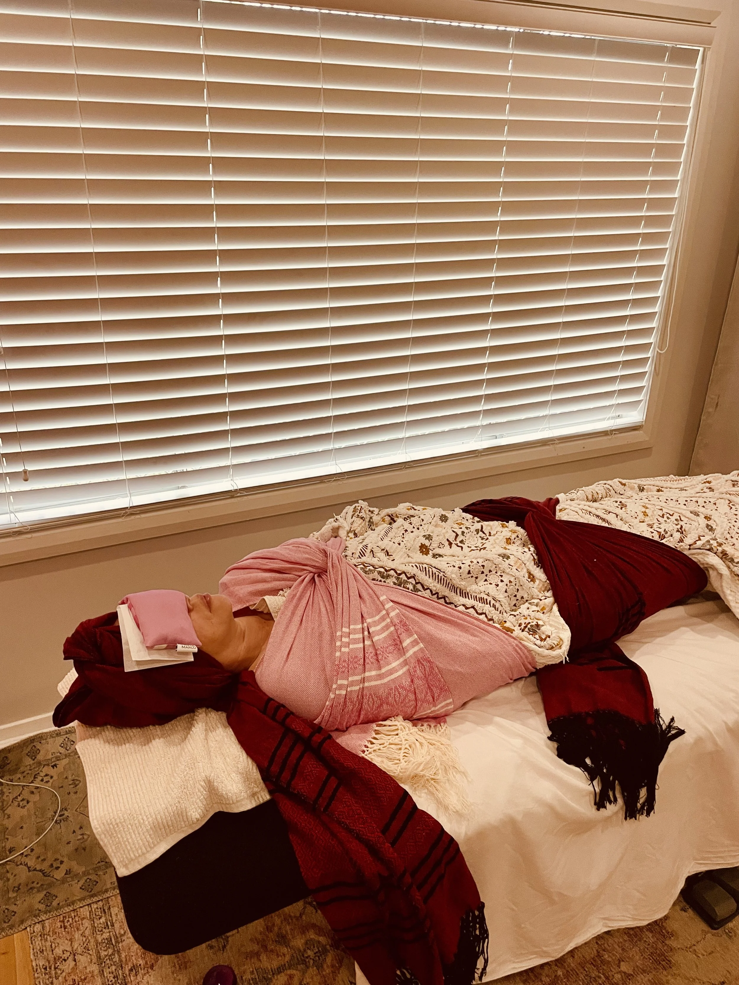 The treatment is finished with a beautiful restoration of the soul wrapping ceremony, where I wrap your feet, hips, shoulders and head, where you’ll rest for 5-10 minutes. The wrapping is optional, and if you need to be unwrapped at anytime, just let me know and I’ll unwrap you.